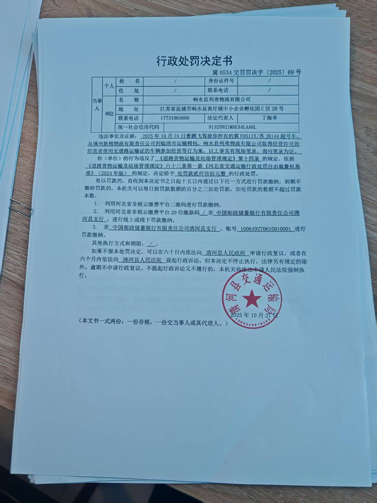 响水县利弗物流有限公司取得经营许可的经营者使用无《道路运输证》的车辆参加普通货物运输的行为案.jpg