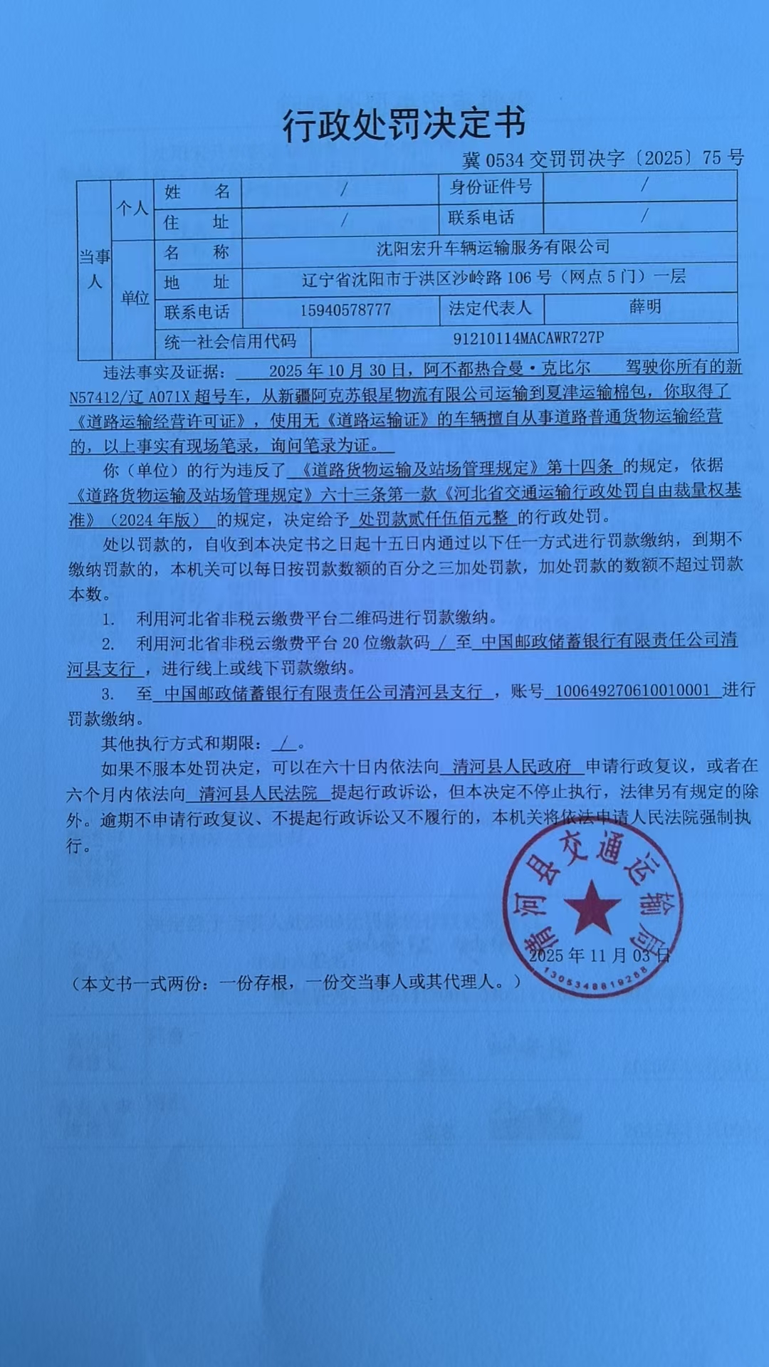 沈阳宏升车辆运输服务有限公司取得经营许可的经营者使用无《道路运输证》的车辆参加普通货物运输的行为案.jpg
