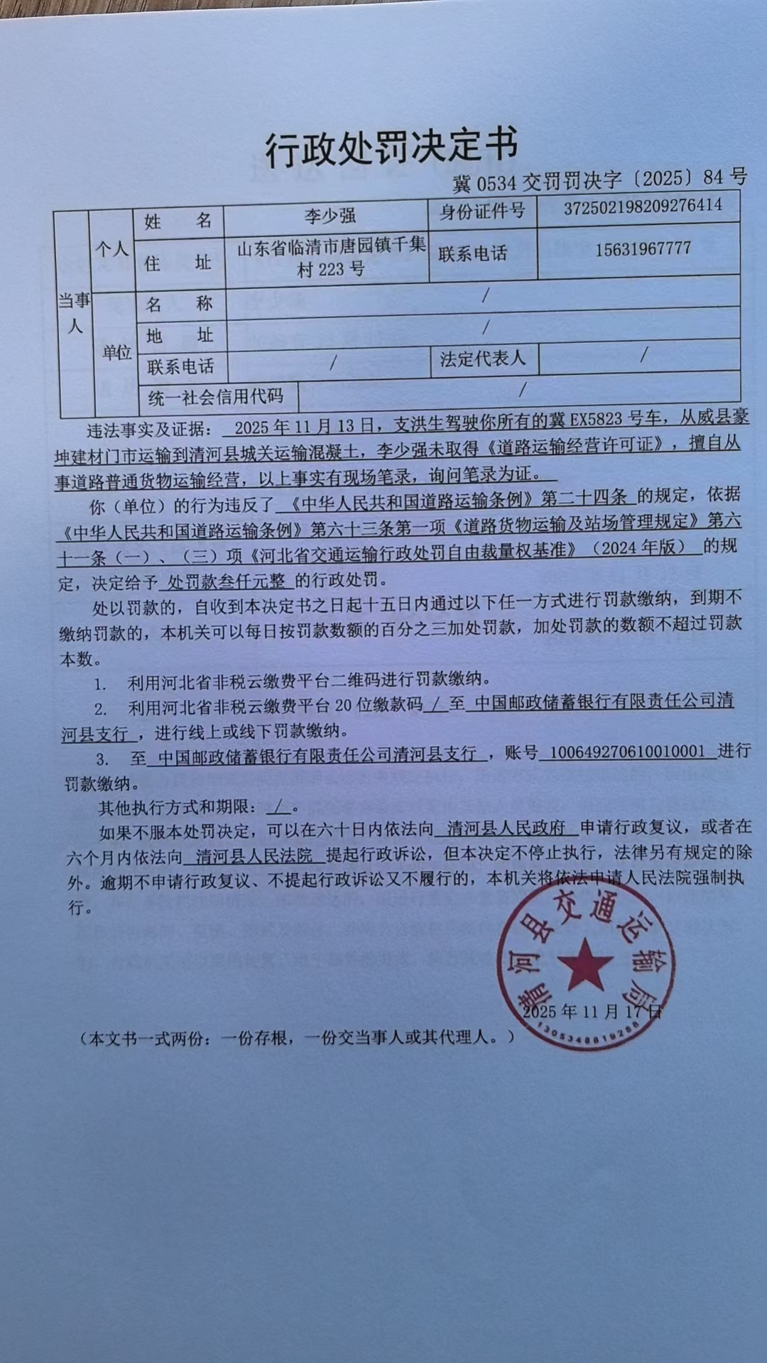 李少强未取得《道路运输经营许可》,擅自从事道路普通货物运输经营行为案.jpg